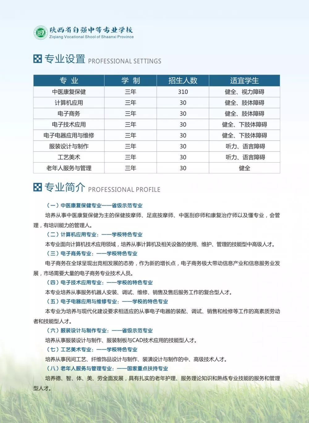 中医康复保健、计算机应用、电子商务、电子技术应用(服务机器人应用与维护方向)、电子电器应用与维修、服装设计与制作、工艺美术、老年人服务与管理。学制均为三年。