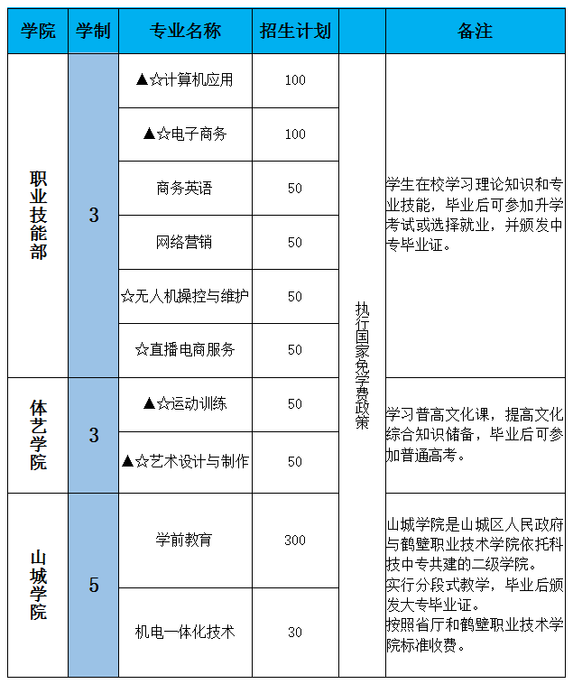 备注:1、☆为校企合作专业,相关企业收取定向技能费;