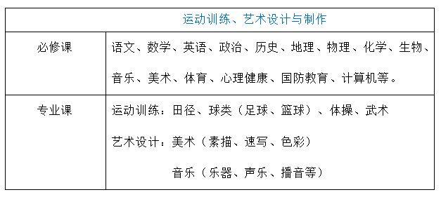 | 专业课 | 运动训练:田径、球类(足球、篮球)、体操、武术 艺术设计:美术(素描、速写、色彩) 音乐(乐器、声乐、播音等) |
