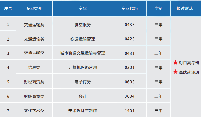 招生专业有:航空服务、铁道运输管理、城市轨道交通运输与管理、计算机网络应用、电子商务、会计、美术设计与制作。