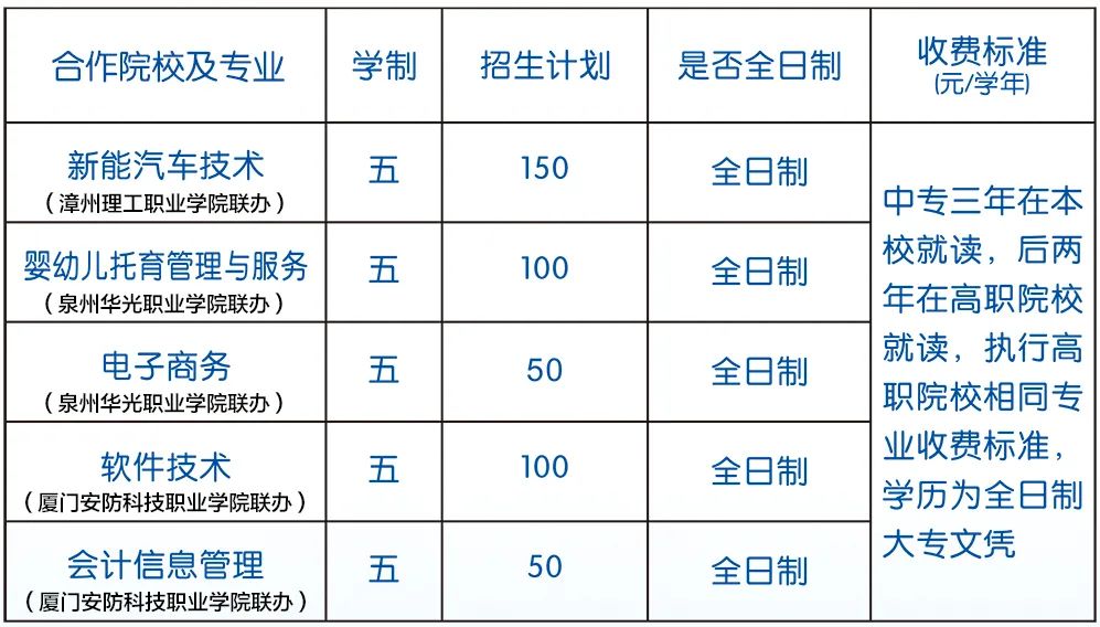 五 | 150 | 全日制 | 中专三年在本 校就读,后两 年在高职院校 就读,执行高 职院校相同专 业收费标准, 学历为全日制 大专文凭 |